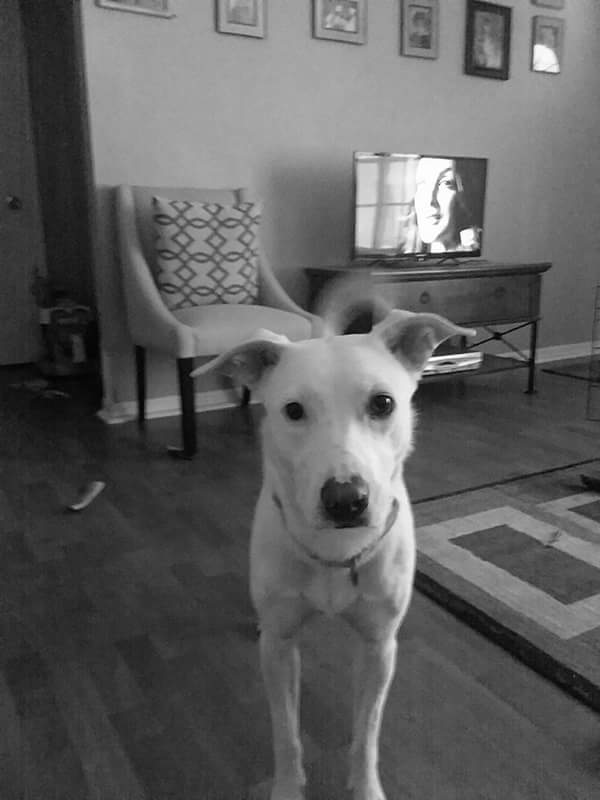 sitting by the door, whimpering and pacing back and forth as if she is in pain.